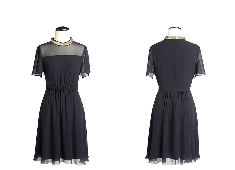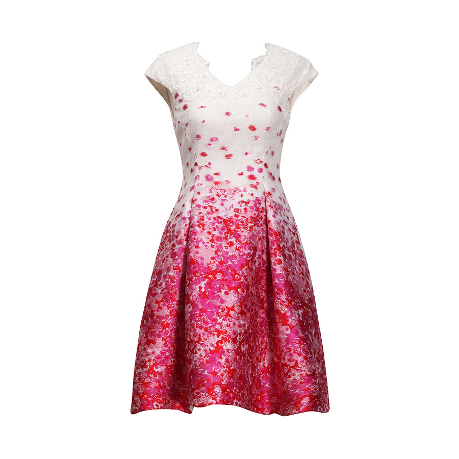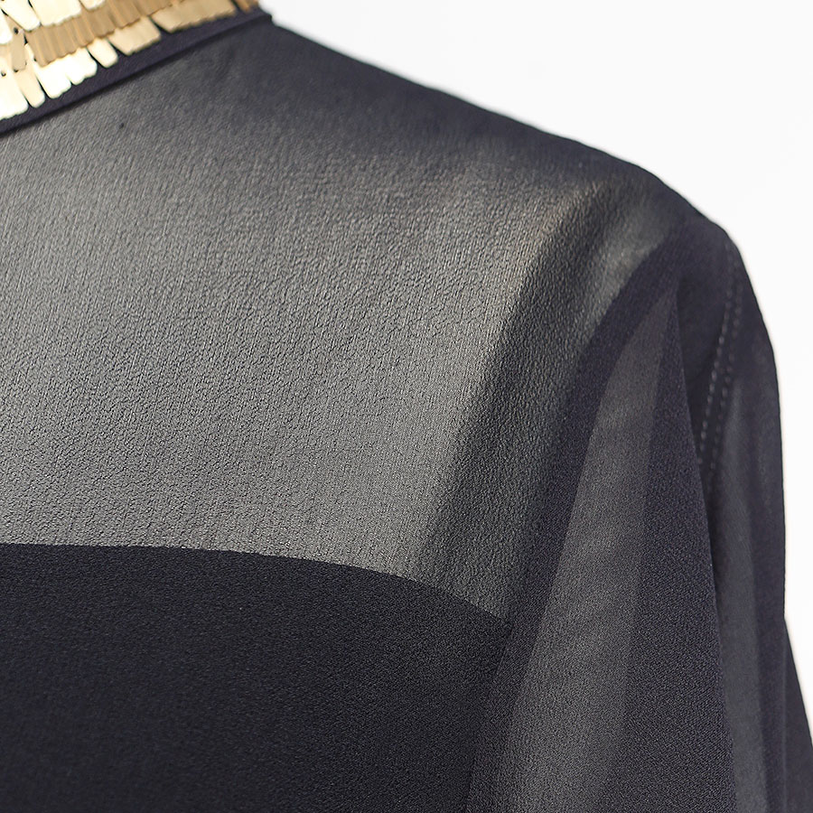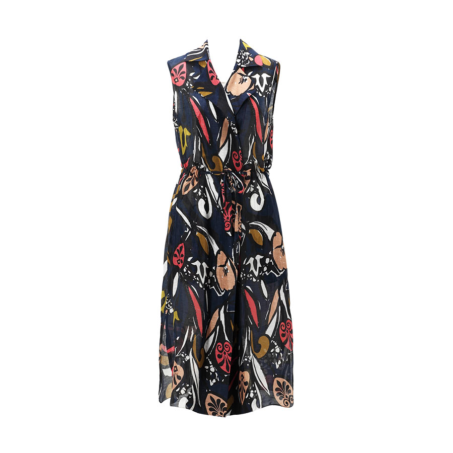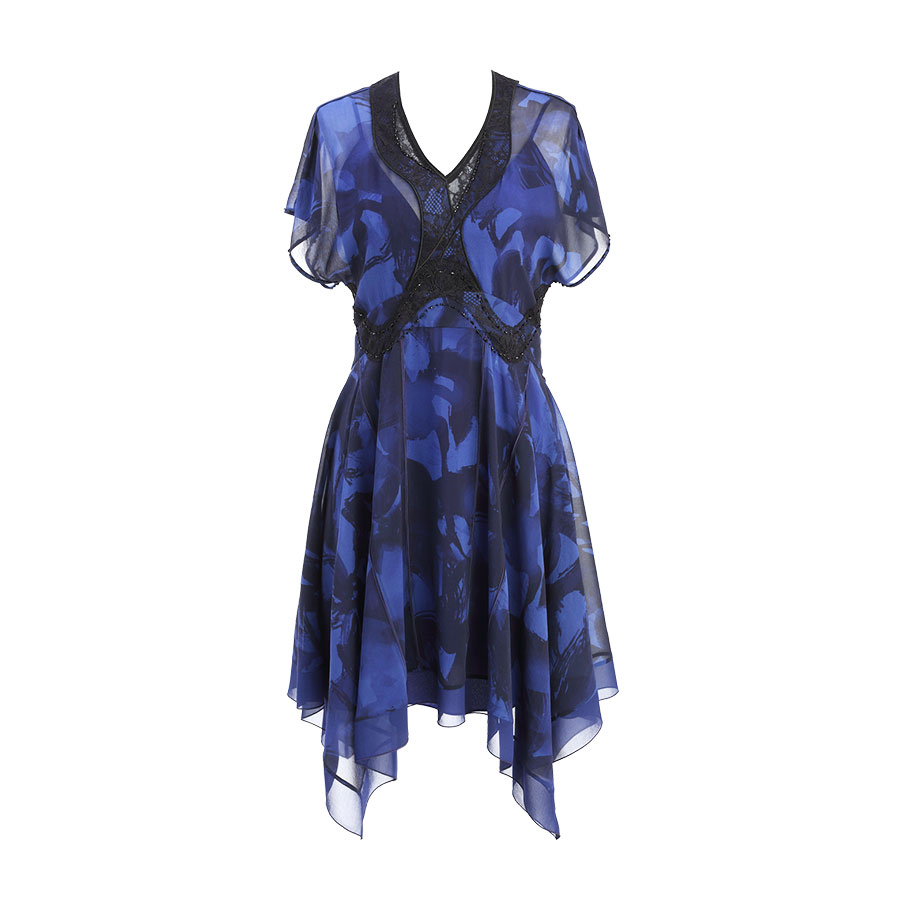藏蓝底色写意花卉,如水墨深深浅浅,行走时如画般行云流水;荷叶袖、不规则下摆以及胸前竖纹拼接等精致设计,视觉上收紧身体线条,衬托出更为纤细玲珑的身姿。