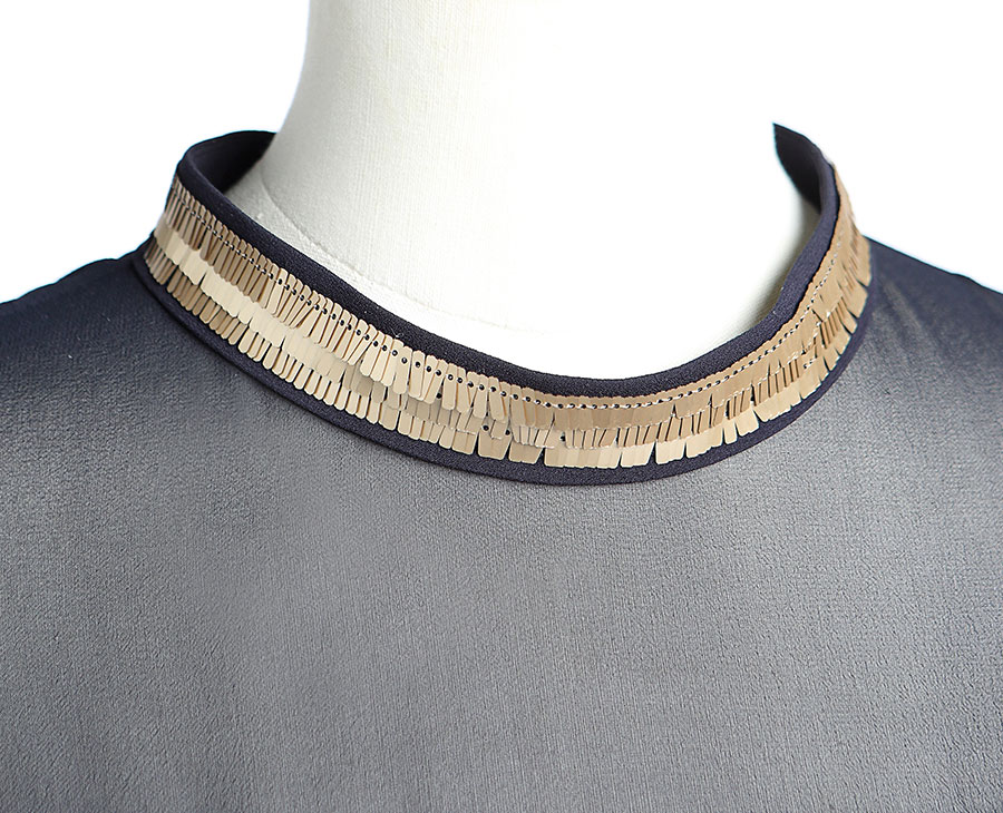 伞摆裙身,灵感源于羽毛的轻逸和鱼尾的灵动,粗犷绣线却化为神奇,以流畅的线条水般流动全身,加以华丽珠片缀饰点睛,女性的柔美气息,淋漓尽释。